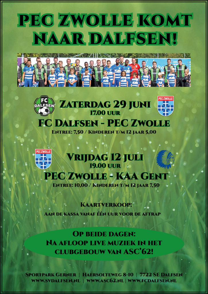 Komende zomer speelt PEC Zwolle wederom op Sportpark Gerner in Dalfsen. Op het programma staan oefenduels met een combinatieteam SV Dalfsen/ASC’62 en het Belgische KAA Gent.