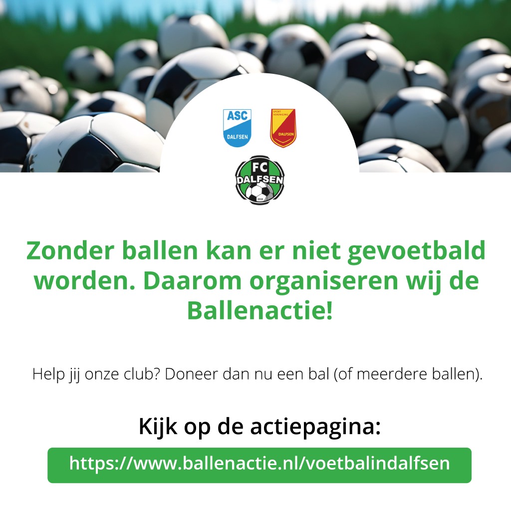 Daarom organiseren wij de Ballenactie! Met deze actie kan iedereen die voetbal in Dalfsen een warm hart toedraagt een bal doneren aan de club. Zo kunnen we er samen voor zorgen dat de voetbal in Dalfsen in ieder geval niet hoeft te bezuinigen op het belangrijkste onderdeel van het spelletje: de ballen!