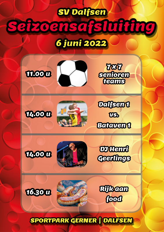 Tweede Pinksterdag staat bij SV Dalfsen in het teken van de afsluiting van het voetbalseizoen 2021/2022. Een succesvol seizoen met vele kampioenschappen รฉn rechtstreekse handhaving van het eerste elftal. Zorg dat je erbij bent op maandag 6 juni!