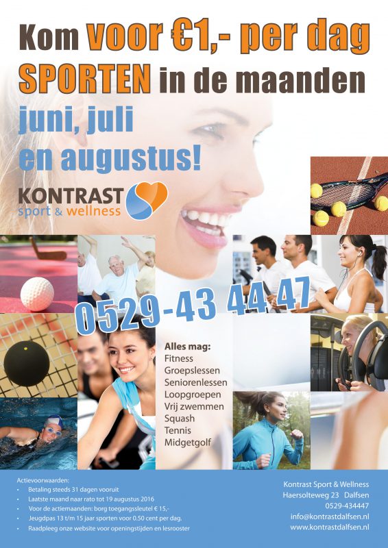 Het voetbalseizoen 2015 – 2016 loopt ten einde. Kontrast heeft wederom een actie om tijdens de zomerstop actief te blijven en conditieverlies, blessures en gewichtstoename te voorkomen. Leden van SV Dalfsen kunnen in de maanden juni, juli en augustus al sporten voor maar €1,00 per dag. Blijf fit en verschijn in augustus weer fit op het trainingsveld!