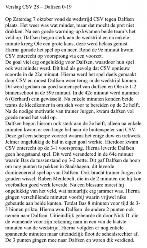 De mannen van het Combiteam JO19-1 hebben voorafgaand aan het seizoen beloofd om een wedstrijdverslag te maken. Geen verslag inleveren betekent € 1,00 per week in de teampot. Het gaat goed met de teampot. Hieronder de verslagen van de jongens die hem hebben gemaakt en ook hebben ingestuurd.