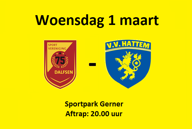 Dalfsen 1 speelt woensdag een oefenwedstrijd tegen Hattem. Het duel op Sportpark Gerner begint om 20.00 uur en wordt gespeeld op veld F. Hattem staat vierde in de Zaterdag 3e klasse C.