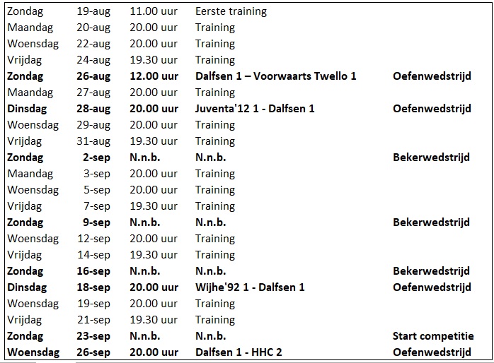 Het seizoen 2017/2018 zit erop. Qua activiteiten op het veld en ook daarbuiten is het de komende weken rustig op Sportpark Gerner; spelers en staf genieten van een welverdiende zomerstop. Vanaf zondag 19 augustus gaat Dalfsen 1 zich voorbereiden op de start van het nieuwe voetbalseizoen. Onder voorbehoud van wijzigingen ziet de voorbereiding er zo uit: