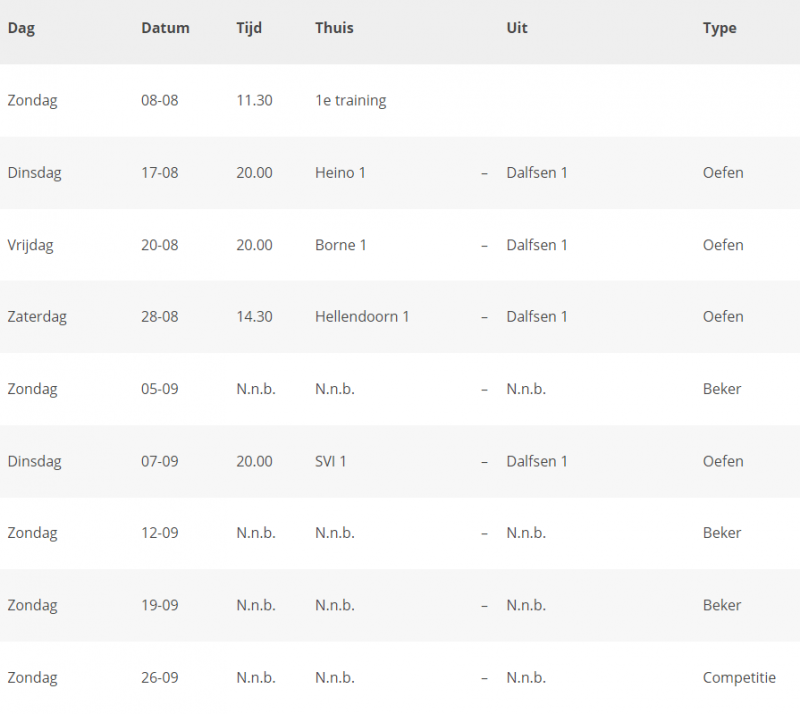 Het eerste elftal begint op zondag 8 augustus met de voorbereiding op het seizoen 2021/2022. Vervolgens staan vier oefenwedstrijden en drie bekerduels op het programma, voordat op zondag 26 september de competitie begint.