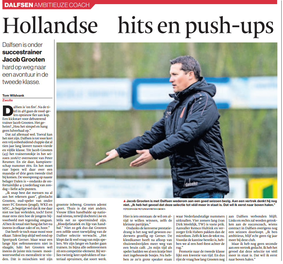 Ondanks het verlies vorige week tegen Dalen staat SV Dalfsen nog steeds bovenaan in de derde klasse C. Onder de kop โ€˜Hollandse hits en push-upsโ€™ gaf trainer Jacob Grooten afgelopen maandag een korte toelichting op dit succes in de Stentor. Het geheim: Hou het simpel en hang geen lulverhaal op.