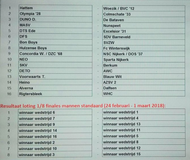 De wedstrijd tegen Alverna wordt gespeeld op zondag 21 januari 2018, aftrap 15.00 uur. Mocht het Dalfsen lukken om de achtste finales te bereiken, dan wacht een uitwedstrijd tegen de winnaar van DUNO – De Bataven.