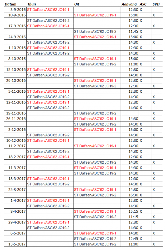Hier en daar heerst onduidelijkheid rondom de gecombineerde O19-junioren. Wanneer spelen zij hun thuiswedstrijden bij SV Dalfsen, en wanneer bij ASC’62? En hoe zit dat bij uitwedstrijden? Uiteraard probeert de combicommissie de wedstrijden zo goed mogelijk te verdelen tussen beide verenigingen, vooral ook met het oog op de kantine-omzet.ย Met onderstaand schema hopen we duidelijkheid te scheppen.