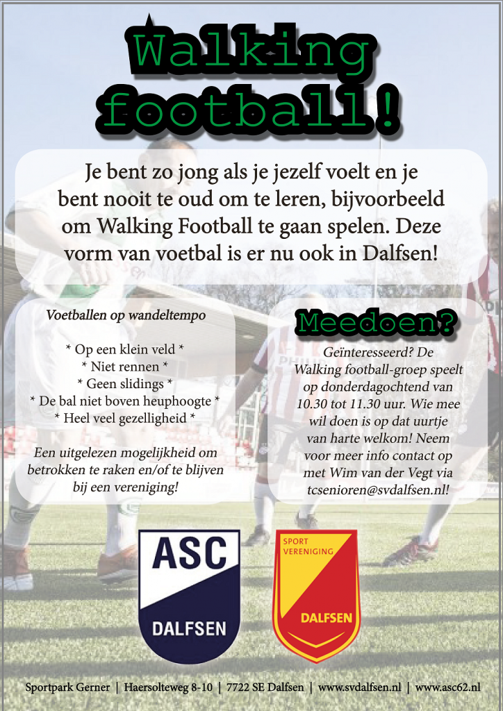 Onlangs peilden SV Dalfsen en ASC’62 de behoefte aan Walking Football in Dalfsen. Dit resulteerde in een overleg met Wim van der Vegt (SV Dalfsen) en André Ekkelenkamp (ASC’62). Hier is besloten om op de donderdagochtenden een start te maken met Walking Football in Dalfsen.