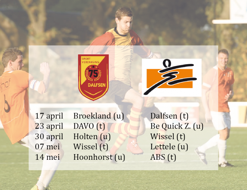 Op Tweede Paasdag, maandag 17 april, speelt Dalfsen 1 een belangrijke wedstrijd in de strijd om het kampioenschap in de Vierde Klasse H. Op het programma staat het uitduel met concurrent Broekland. Om de selectie te steunen, rijdt er maandag, bij voldoende aanmeldingen, een supportersbus vanaf Sportpark Gerner.