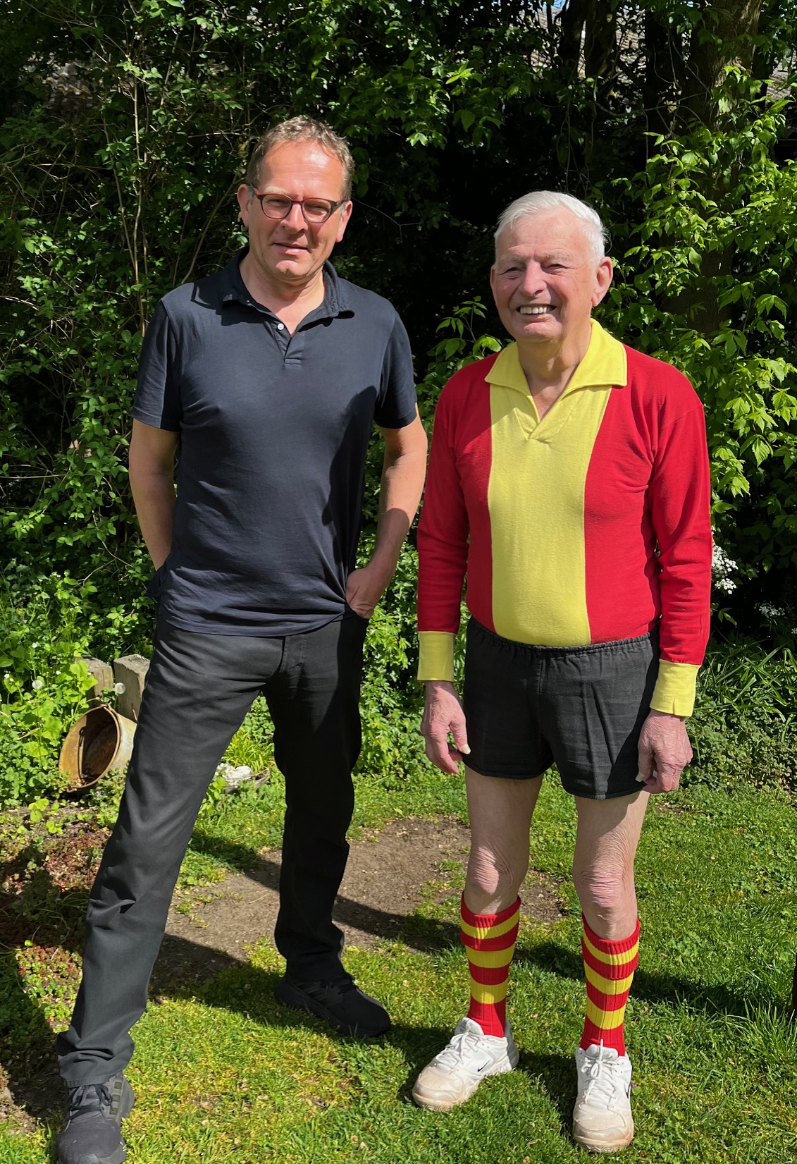 Een afspraak was snel gemaakt en afgelopen zaterdag ging voorzitter Dirk Mosterman op bezoek bij Erelid Gerard Feijen uit Dalfsen. Gerard is inmiddels 90 jaar en heeft zo’n 70 jaar geleden in diverse teams van SV Dalfsen gevoetbald. Destijds was het gebruikelijk dat elk lid zijn eigen tenue aanschafte en shirtreclame of rugnummers bestonden nog niet.