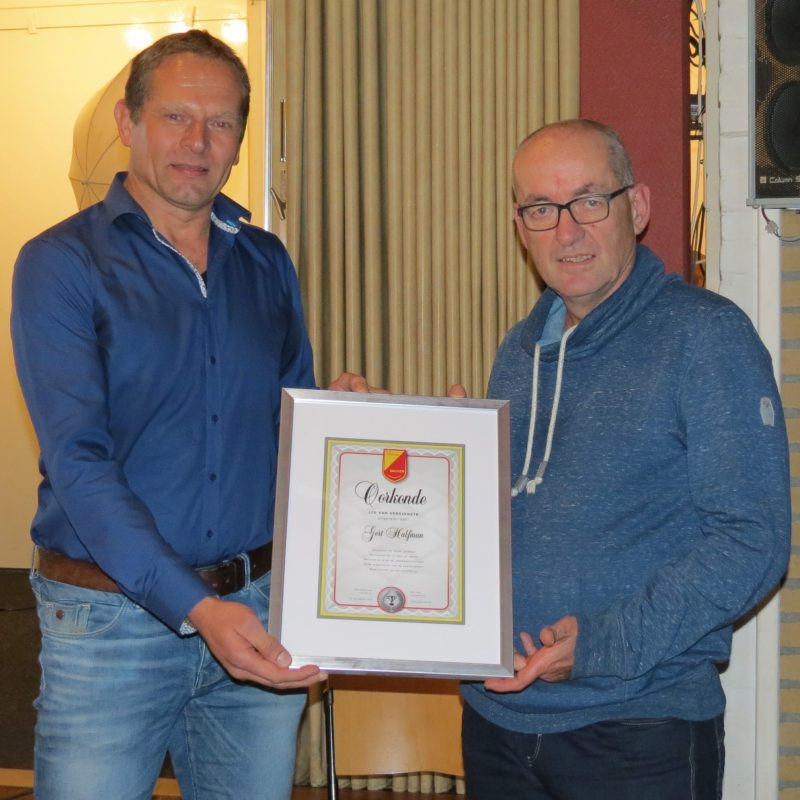 Uit handen van Dirk Mosterman ontving Gert de oorkonde en een mooie bos bloemen. Gert, proficiat en nogmaals dank wat je voor de vereniging hebt gedaan en hopelijk nog een hele tijd blijft doen.