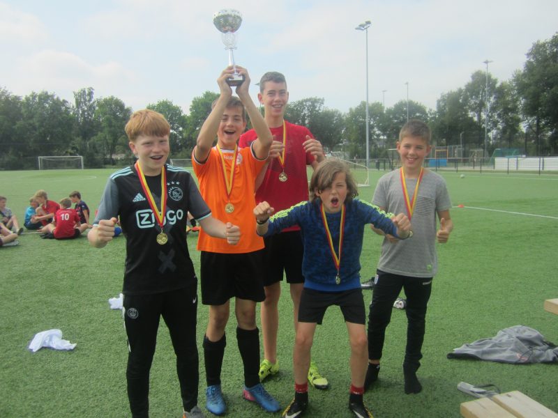 Zondagochtend zaten we rond negen uur alweer aan de ontbijttafel. De laatste dag was aangebroken, wat was het weer snel gegaan. Nadat de tenten waren leeggehaald, stonden de finales van onze eigen Champions League op het programma. In een spannende eindstrijd versloeg Juventus uiteindelijk Real Madrid en zo mochten Jorn van der Vegt, Stijn Dam, Thijme van der Maaten, Finn Bosch en Camiel van Ommen de felbegeerde beker omhoog houden. Ondertussen was ook bij het rodedraadspel een winnaar bekend. Thijme gooide zijn pijlen het beste in het bord en kroonde zich dat dartkampioen.