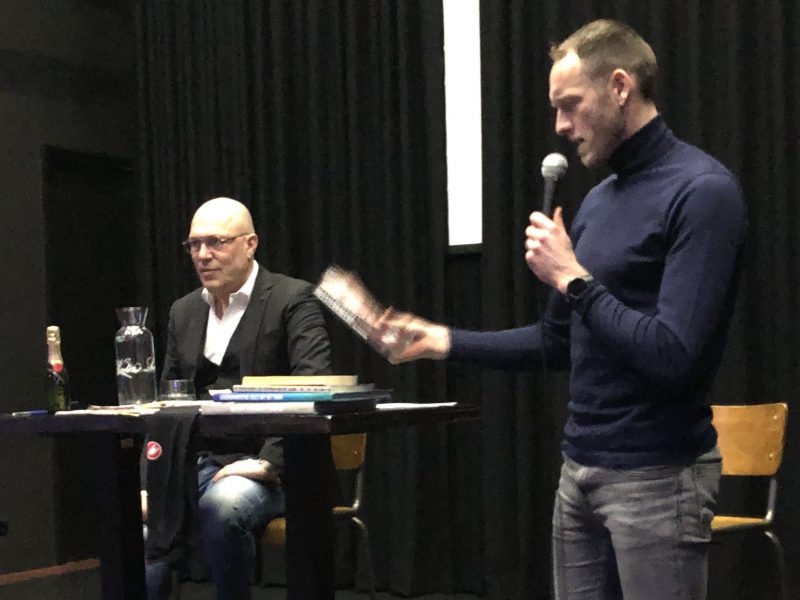 Na een kort welkom was het woord aan gastspreker Gert Jakobs die aan de tand werd gevoeld door interviewer Tom Wildvank. Een geanimeerd gesprek volgde waarbij de sportieve hoogtepunten van Gert werden afgewisseld met enkele persoonlijke ervaringen van na zijn wielercarrière. De tijd vloog voorbij en even voor tien was het tijd voor een hapje en een drankje.