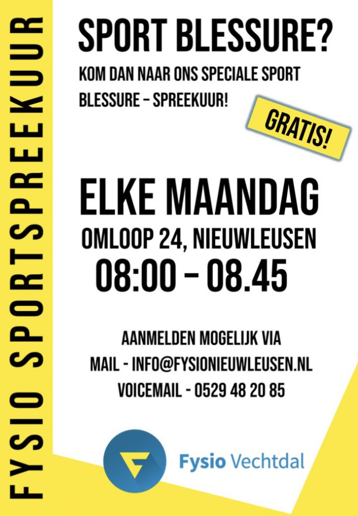 Onze sponsor Fysio Vechtdal, gevestigd aan de Omloop 24 in Nieuwleusen, houdt wekelijks een gratis sportblessure spreekuur. Deze vindt iedere maandag plaats van 08.00 tot 08.45 uur.