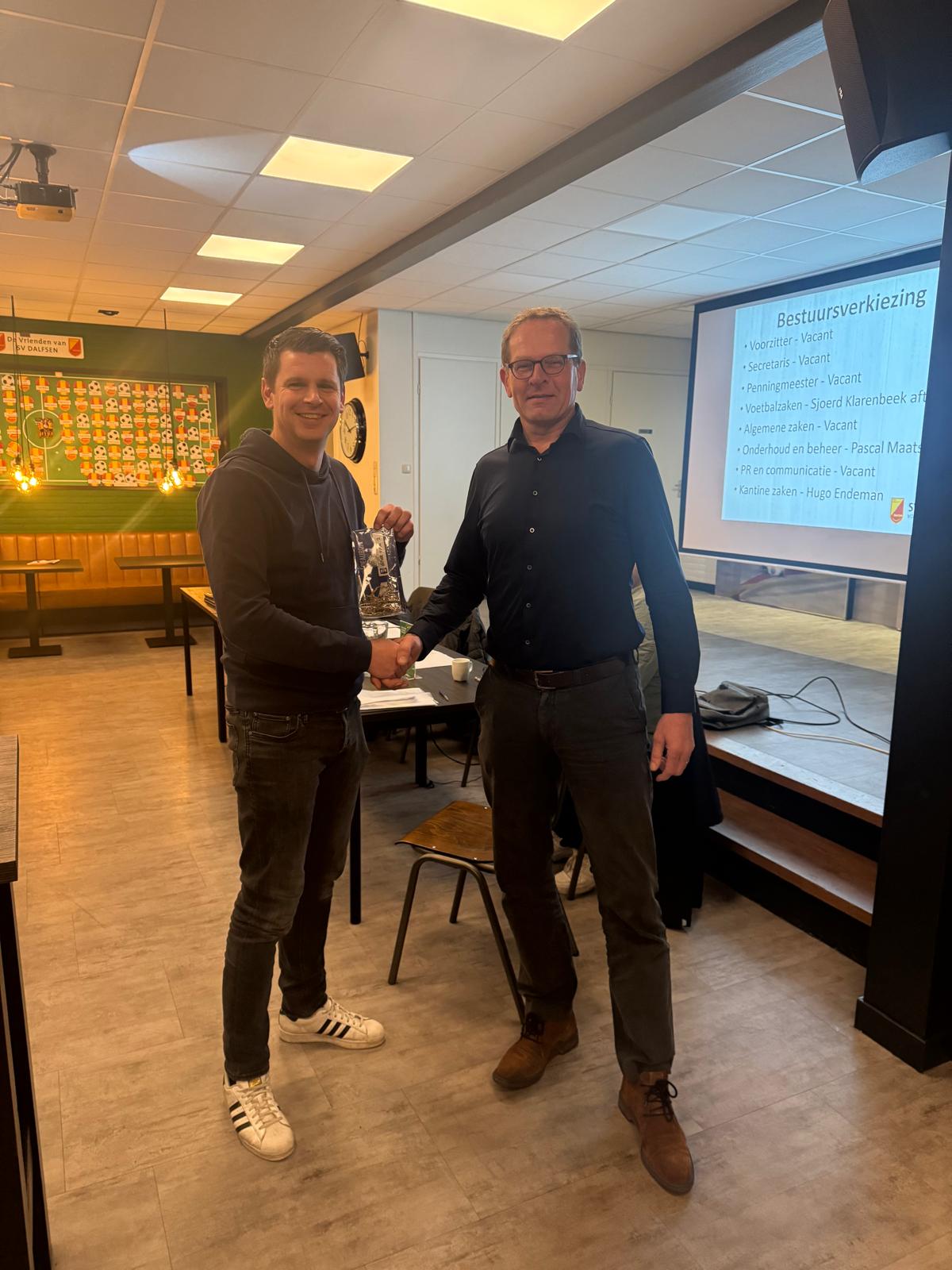 Direct na de bestuursverkiezing werd Sjoerd door voorzitter Dirk Mosterman bedankt voor zijn diensten. Sjoerd was naast bestuurslid gedurende zijn bestuursperiode ook actief voetballer bij het eerste team en was hij speler/trainer bij het tweede team. Een echte liefhebber die nu gaat afbouwen bij zijn vrienden in het derde. Namens de vereniging kreeg Sjoerd een diner voor twee en dat is dik verdiend!