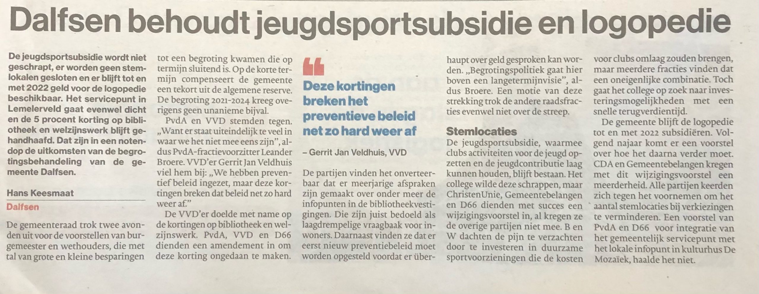 Afgelopen week heeft de gemeenteraad van Dalfsen een aantal besparingsvoorstellen van het college besproken, waaronder het schrappen van de jeugdsportsubsidie.