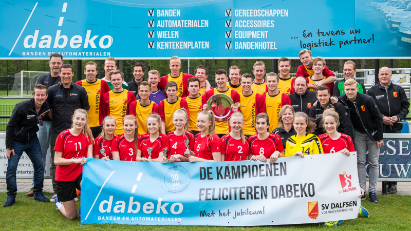 50. De kampioenen Dalfsen 1 (voetbal) en C1 (handbal) feliciteren hoofdsponsor Dabeko met het 30-jarig jubileum. (Mei)