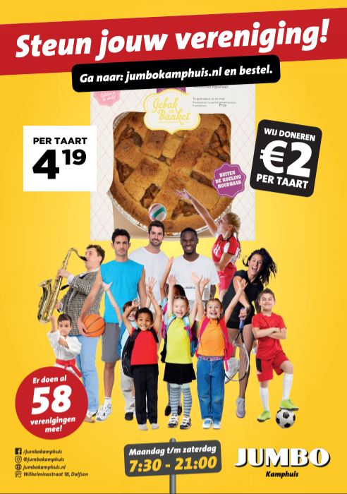 Doe mee met de Jumbo Kamphuis appeltaartenactie en ondersteun SV Dalfsen. Hoe werkt het? Bestel op jumbokamphuis.nl een heerlijke appeltaart. Selecteer SV Dalfsen uit de lijst met 58 verenigingen. De taart kost โฌ 4,19 en hiervan gaat โฌ 2,00 direct naar SV Dalfsen.