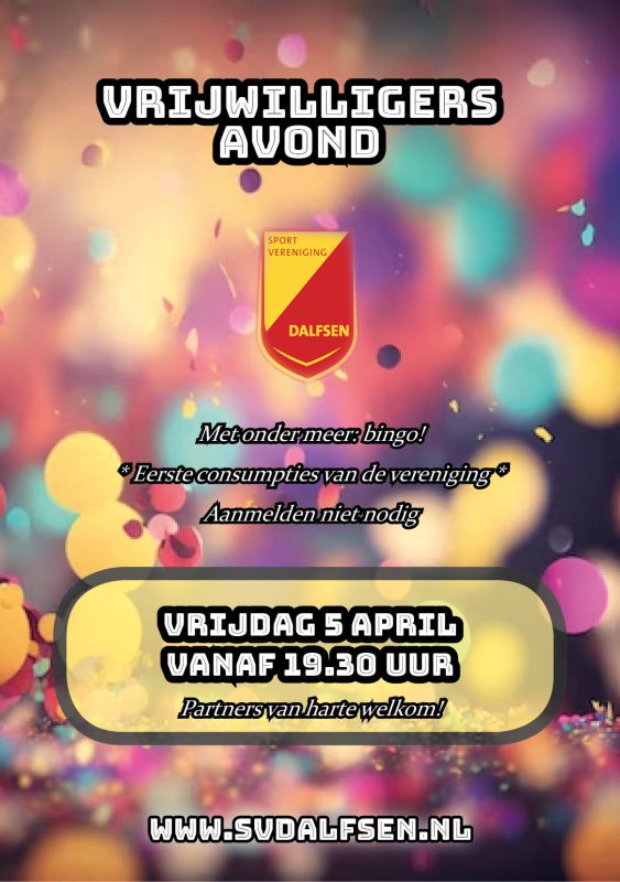 Een vereniging kan niet bestaan zonder vrijwilligers. Om onze trouwe vrijwilligers te bedanken voor hun inzet, organiseert SV Dalfsen op vrijdag 5 april een vrijwilligersavond.
