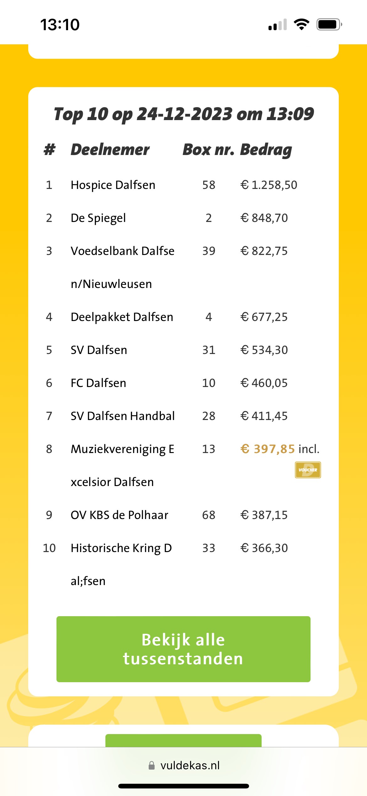 SV Dalfsen scoort lekker bij de Vul de Kas actie van Jumbo Kamphuis. Met nog enkele dagen te gaan (de actie sluit op oudejaarsdag) staan we op een stevige vijfde plaats met een bedrag van maar liefst EUR 534,30.