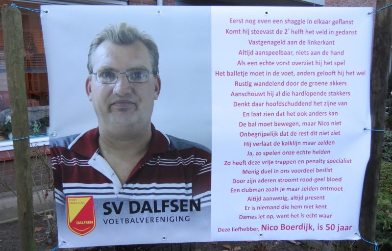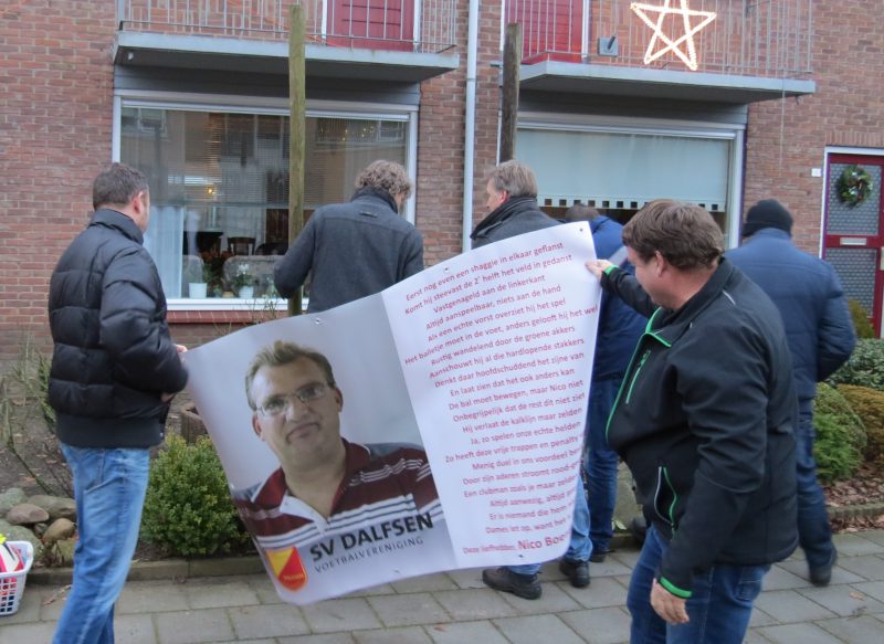 SV Dalfsen veteraan en penalty-specialist Nico Boerdijk viert op 2e kerstdag zijn 50e verjaardag. Op kerstavond werd zijn tuin aan de Ankummerstraat omgetoverd tot een dependance van Madame Tussaud. Diverse poppen, al dan niet verlicht, voorzien van attributen als een schoffel, gehaktbal en doorwerkjas. Na de plaatsing werd de gezellige huiskamer van Boerdijk omgetoverd tot een partycenter inclusief muziek, hapjes en drankjes. Nico van harte proficiat en de veteranen van SV Dalfsen hopen dat je nog vele jaren onderdeel mag uitmaken van dit superteam!