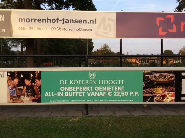 Maandagavond is rond het hoofdveld op Sportpark Gerner wederom een nieuw reclamebord geïnstalleerd. Dit keer een dubbelzijdig gedrukt reclamebord van De Koperen Hoogte, het welbekende restaurant aan de Lichtmisweg in Zwolle.