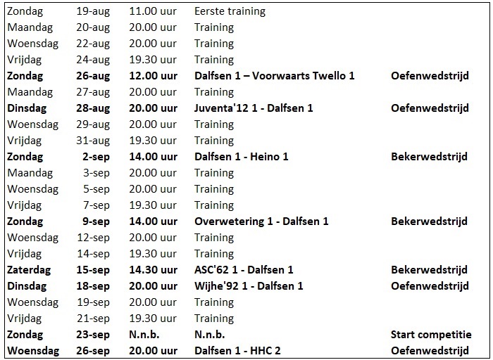 De eerste oefenwedstrijd volgt een week na de eerste training, thuis tegen Voorwaarts Twello, uitkomend in de Tweede klasse J. Twee dagen daarna staat in Wierden een oefenduel op het programma met zondag vierdeklasser Juventa’12. Later volgen nog ontmoetingen met Wijhe’92 en HHC 2.ย In de beker neemt Dalfsen het op tegen ASC’62, Heino en Overwetering.