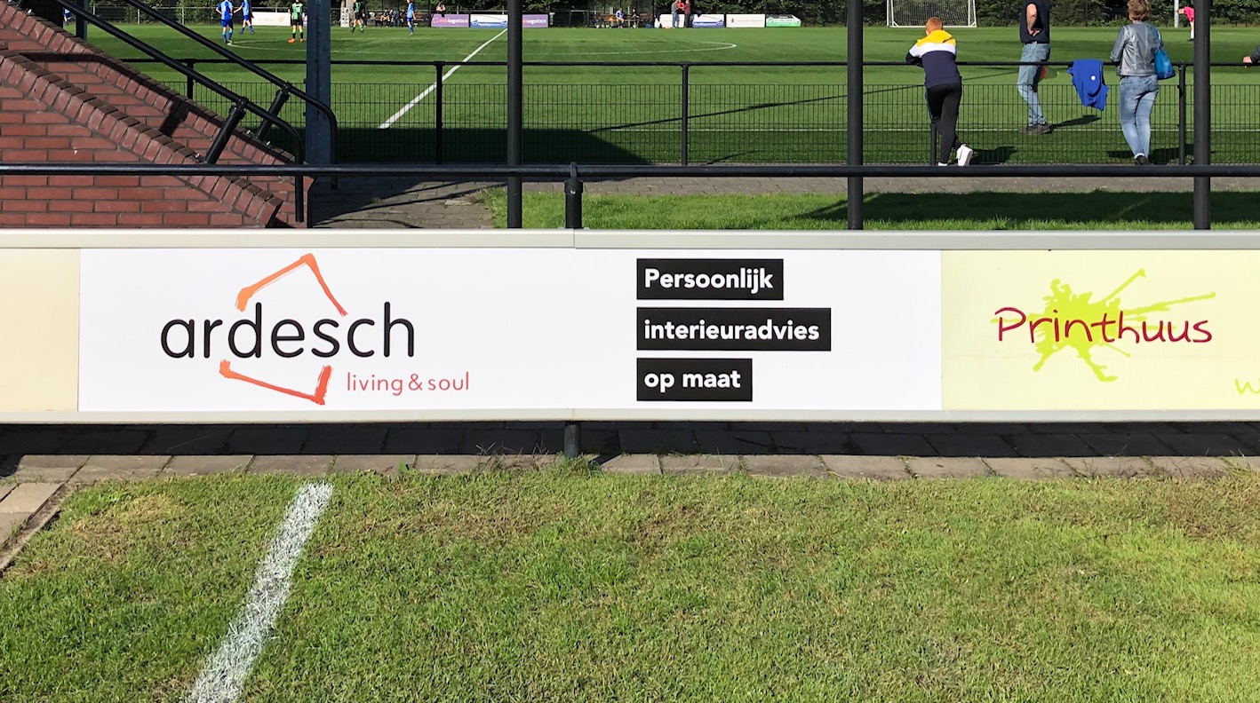 De twee reclameborden op het hoofdveld zien er weer fris en strak uit. Het stijlvolle en eigentijdse logo valt duidelijk op en de begeleidende tekst geeft direct weer waar het bedrijf zich in onderscheidt.