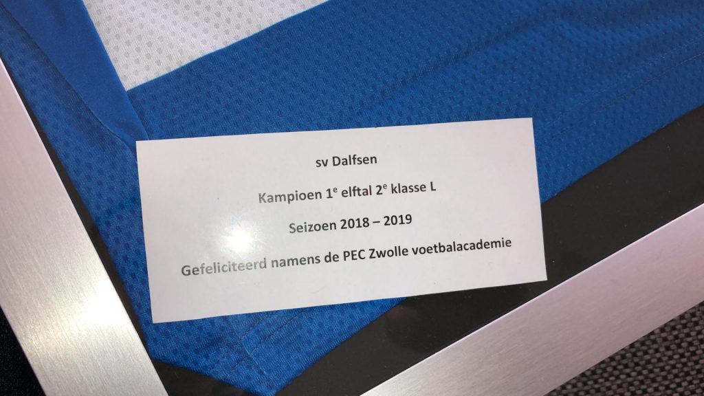 In verband met het behaalde kampioenschap ontving SV Dalfsen uit handen van Paul Vermeulen van PEC Zwolle zondagmiddag een geweldig cadeau; een officieel PEC Zwolle-shirt voorzien van een mooie lijst.