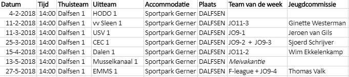 Ook dit seizoen zijn de teams in de leeftijdscategorieën JO11, JO09 en F-League één keer aan de beurt als team van de week. Dit houdt in dat de pupillen bij een thuiswedstrijd van Dalfsen 1 mogen oplopen met de spelers van het eerste elftal. In de rust spelen ze een partijtje op het hoofdveld en natuurlijk krijgen ze wat lekkers in de kantine.