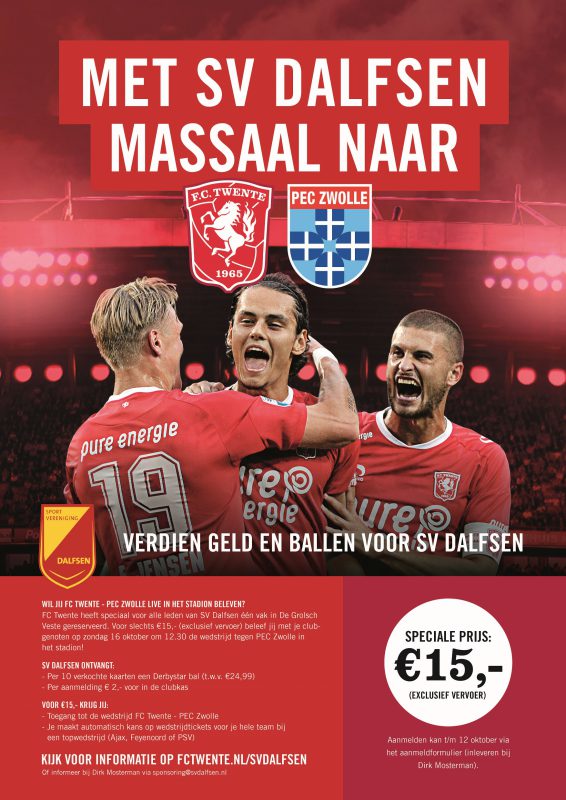Heb je nog vragen over het bezoek van SV Dalfsen aan de wedstrijd FC Twente – PEC Zwolle? Kijk dan op www.fctwente.nl/svdalfsen of neem contact op met Dirk Mosterman via sponsoring@svdalfsen.nl.