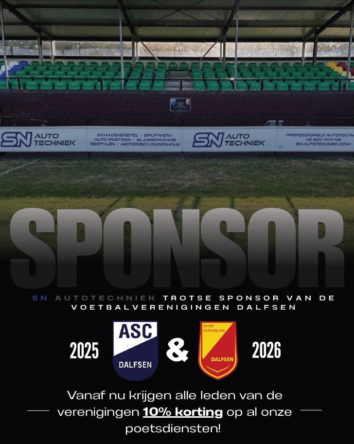 Graag vragen wij uw aandacht voor een speciale actie van onze sponsor SN Autotechniek. Alle leden van SV Dalfsen en ASC’62 krijgen vanaf nu 10% korting op alle poetsdiensten. Een afspraak maken kan via e-mail op info@sn-autotechniek.com, via WhatsApp of telefonisch op 06 820 404 49.
