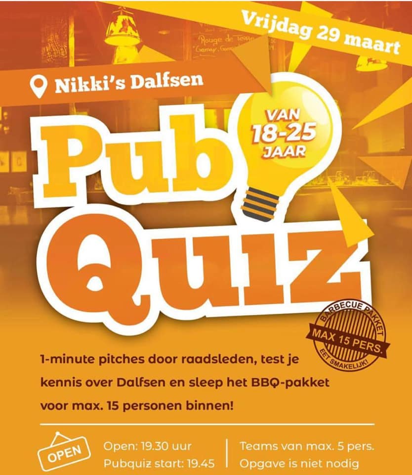 JONG!Dalfsen, SAAM Welzijn en de gemeente Dalfsen organiseren een pubquiz bij onze sponsor Nikki’s. Deze vindt plaats op vrijdagavond 29 maart. Het winnende team gaat ervandoor met een barbecuepakket voor maximaal vijftien personen.