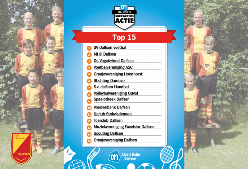Albert Heijn Dalfsen heeft de tweede tussenstand bekendgemaakt van de AH Supportersactie. Van de 43 deelnemende verenigingen staat SV Dalfsen Voetbal momenteel bovenaan. De actie loopt nog tot en met zaterdag 12 mei.