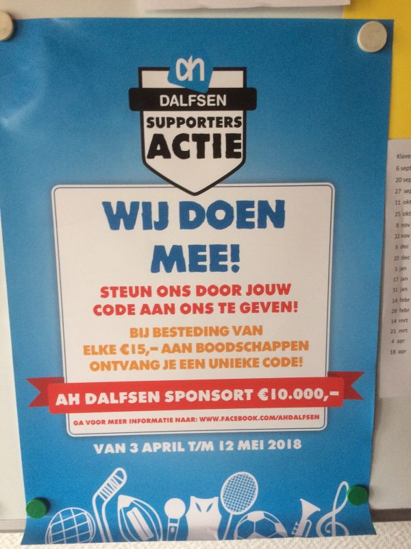 De actie start vanaf 3 april, waarbij de klanten van AH Dalfsen voor elke โฌ 15 aan boodschappen een unieke code ontvangen. De code kan viaย een speciale website verzilverd worden, waarbij de klant bepaalt welke vereniging hij of zij sponsort. De actie heeft een looptijd van zes weken waarna de balans kan worden opgemaakt. Binnenkort volgt meer informatie.