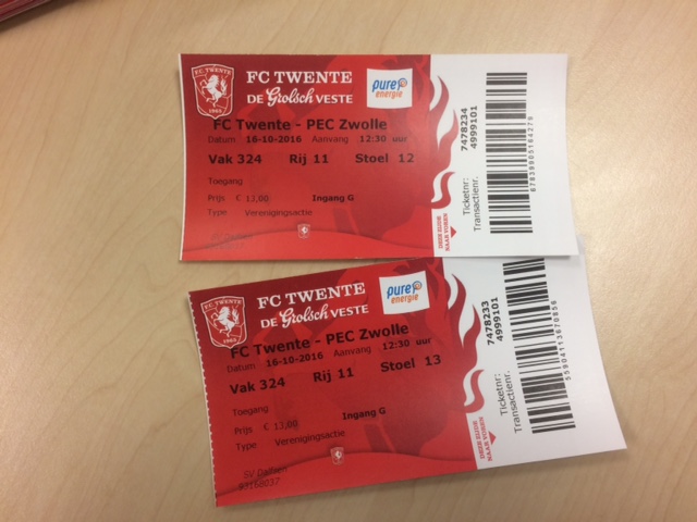 Alle deelnemende actieve spelers van SV Dalfsen die de wedstrijd FC Twente – PEC Zwolle hebben bezocht maken kans op wedstrijdtickets voor hun hele team bij een topwedstrijd van FC Twente naar keuze (Ajax, Feyenoord of PSV). Direct na aankomst wordt de winnaar van deze actie in het clubgebouw bekend gemaakt. Dus ben je benieuwd naar de uitslag van deze verloting kom dan na aankomst in Dalfsen in het clubgebouw en hoor of je gewonnen hebt!
