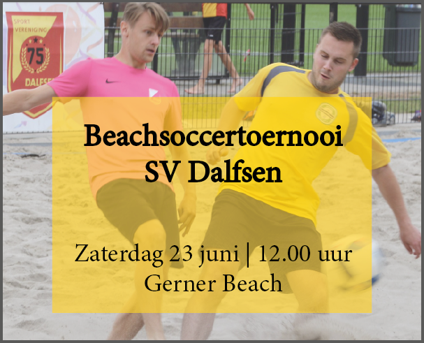 Op zaterdag 23 juni organiseert SV Dalfsen een beachsoccertoernooi. Op Gerner Beach gaat het die middag los vanaf 12.00 uur. Het wordt de tweede editie van het toernooi, dat vorig jaar werd gewonnen door Biercelona (senioren) en C2 (jeugd).