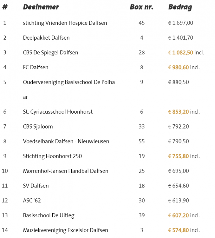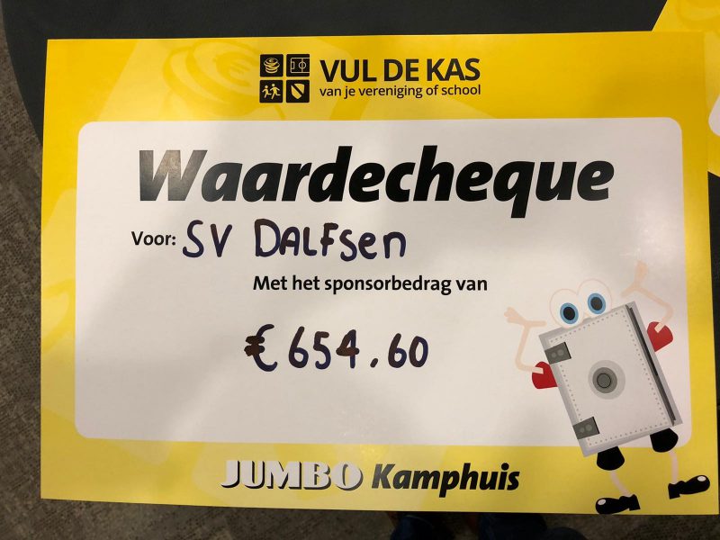 De afgelopen maanden kregen klanten bij de Jumbo bij iedere 10 euro aan boodschappen een voucher die 10 cent vertegenwoordigde. Deze kon worden toegekend aan een van de zestig deelnemende verenigingen. Daarvan eindigde SV Dalfsen op een mooie elfde plaats. Ook jeugdafdeling FC Dalfsen deed mee en mocht maar liefst 980,60 euro bijschrijven.