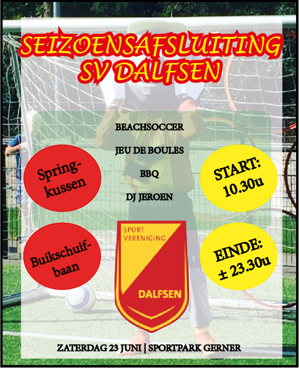 De officiële seizoensafsluiting van SV Dalfsen vindt plaats op zaterdag 23 juni met de familiedag en aansluitend een feestavond. De activiteitencommissie heeft, in samenwerking met de beachsoccer organisatie, een fraai programma opgesteld, dat duurt van 10.30 uur tot ongeveer 23.30 uur.