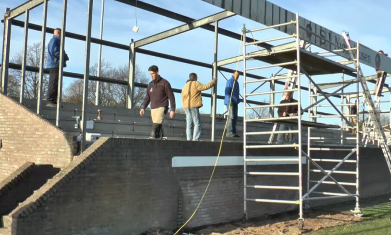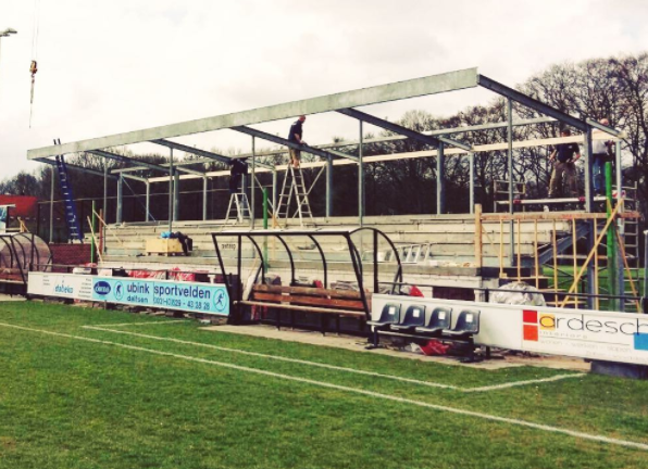 16. Vrijwilligers van SV Dalfsen en ASC’62 beginnen op Sportpark Gerner met de bouw van de tribune. (Maart)