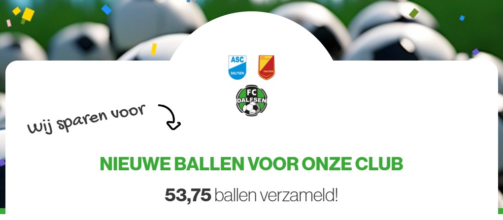 De ballenactie van SV Dalfsen, ASC’62 en FC Dalfsen heeft tot nu toe maar liefst 53 ballen opgeleverd. Hier zijn we als verenigingen natuurlijk ontzettend blij mee maar een paar extra ballen zijn natuurlijk altijd welkom. Nog niet meegedaan met de actie? Kijk dan op de actiepagina: https://www.ballenactie.nl/voetbalindalfsen