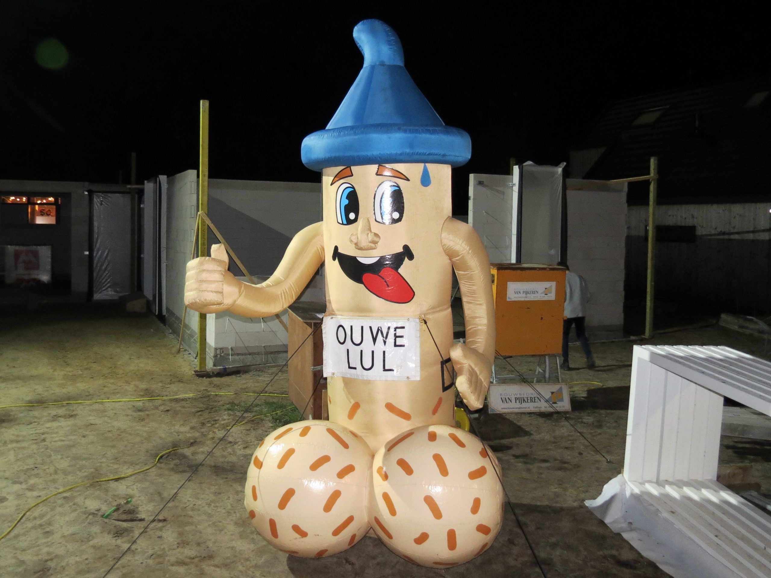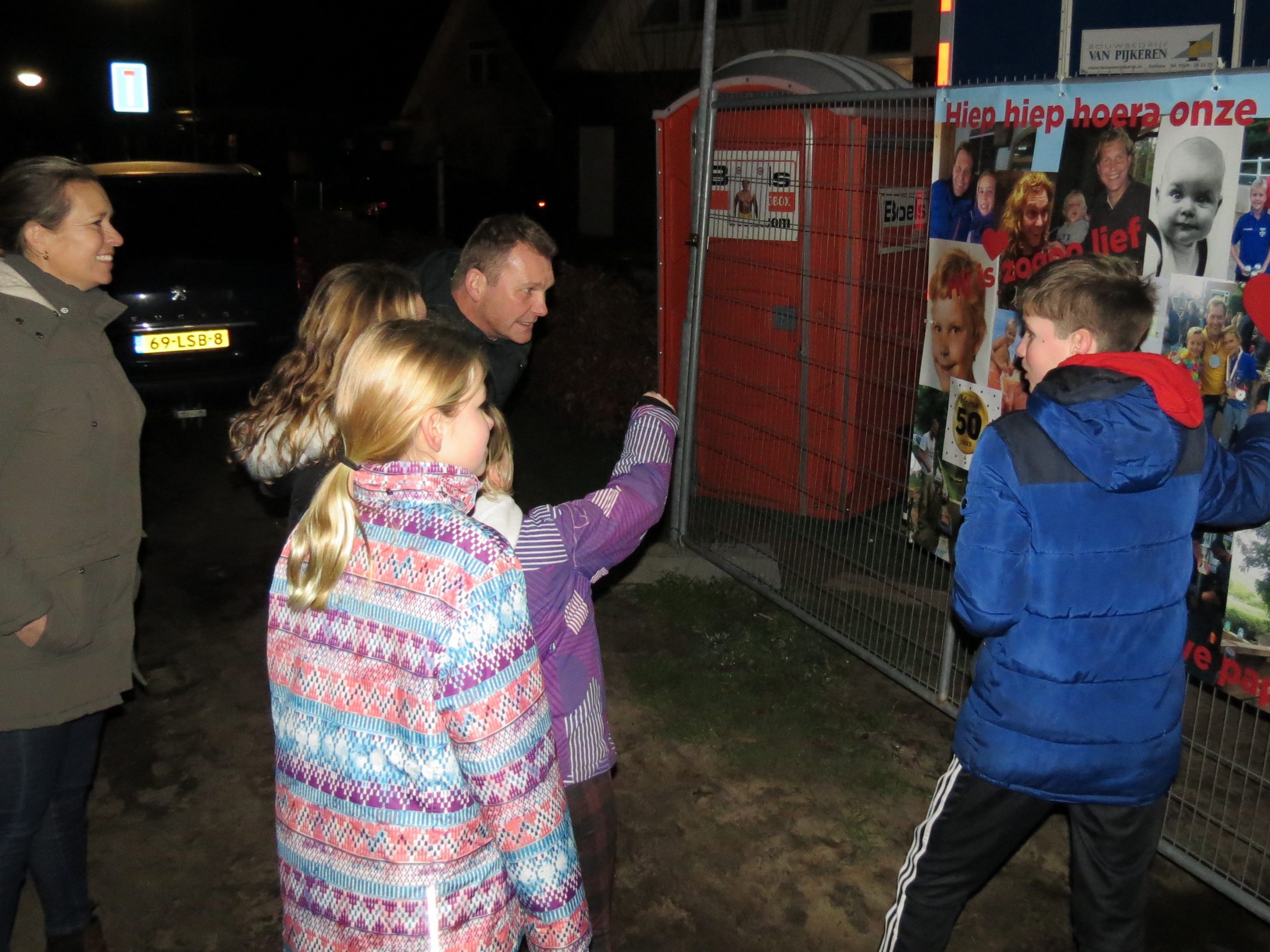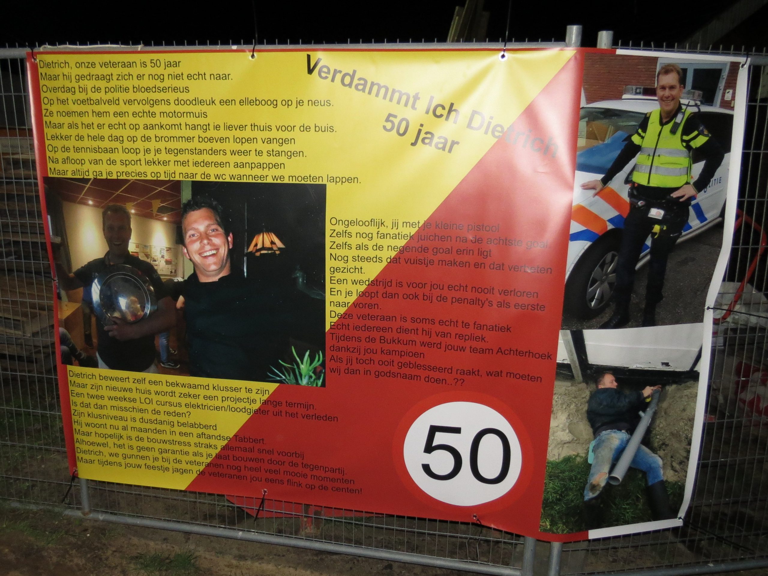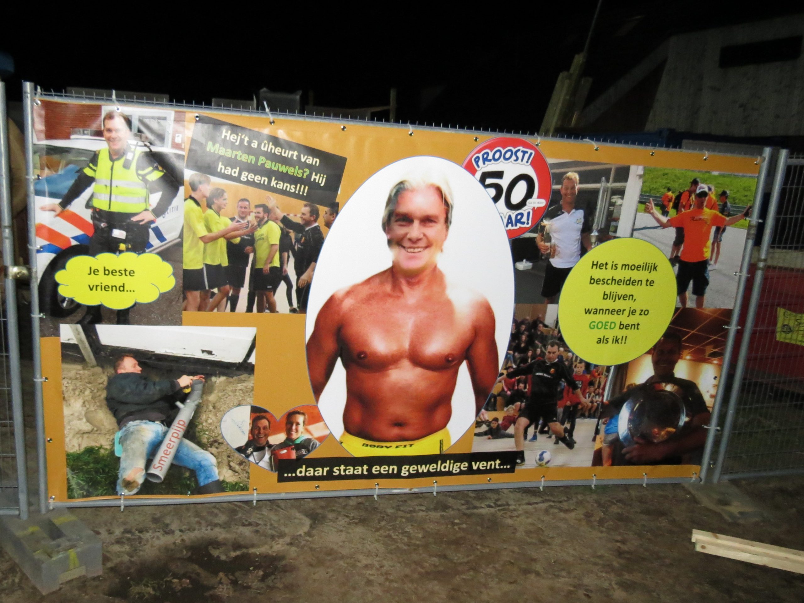 Een tweetal bouwlampen zorgde voor een goed verlicht โpodiumโ waarop een groot aantal spandoeken en artikelen in de spotlights werden gezet. Centraal thema was de 50e verjaardag van de bewoner van het tijdelijke pand; Ditrich Berghout.