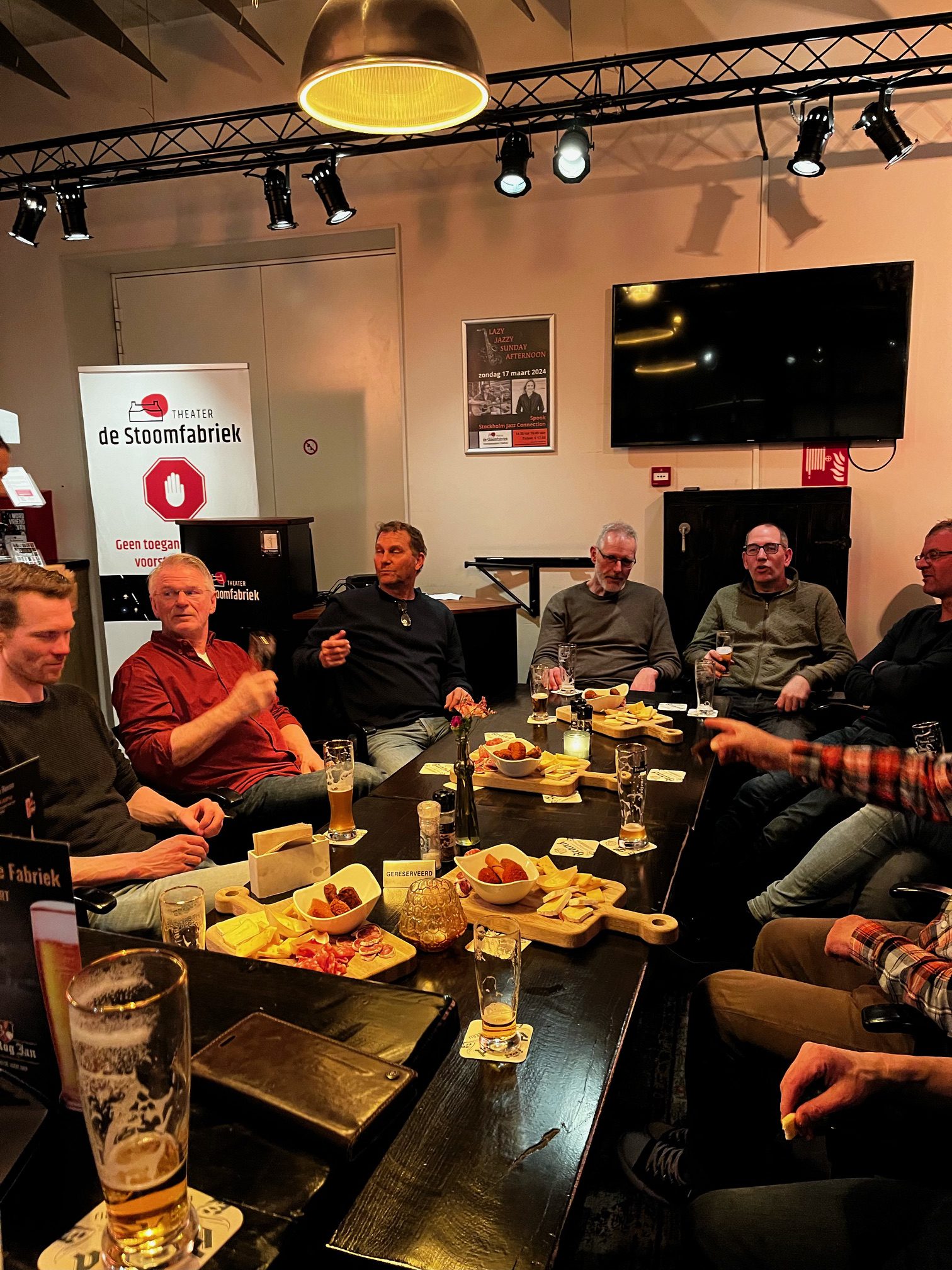 Na het actieve deel werd de tocht voortgezet richting tassensponsor De Fabriek. Onder het genot van een goed gevulde kaasplank en een vers getapt sapje werd het spijkerslaan geëvalueerd. Ook sloten een aantal verlate veteranen aan wat het feest compleet maakte. Tenslotte werd de trip doorgezet naar shirtsponsor Het Oude Station. Hier had uitbater Joost gezorgd voor een gezellige sound en wederom een hapje en een drankje. Rond sluitingstijd werd de balans op gemaakt en geconcludeerd dat dit zeker voor herhaling vatbaar is.