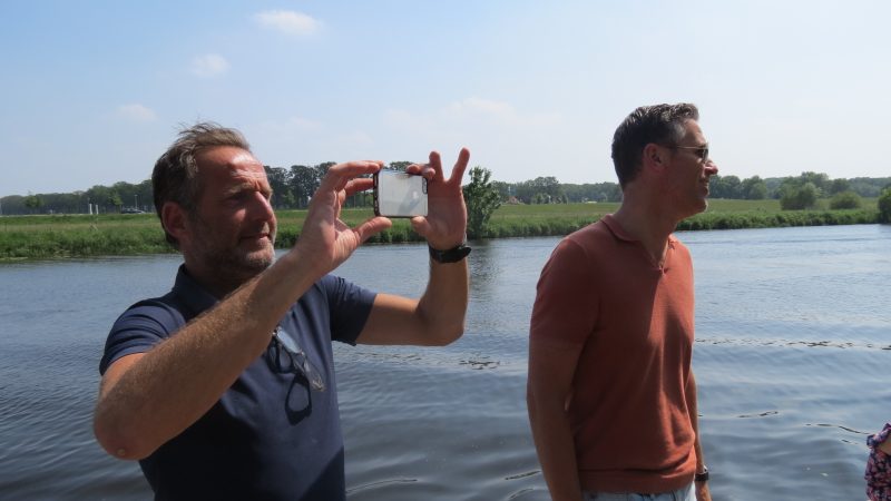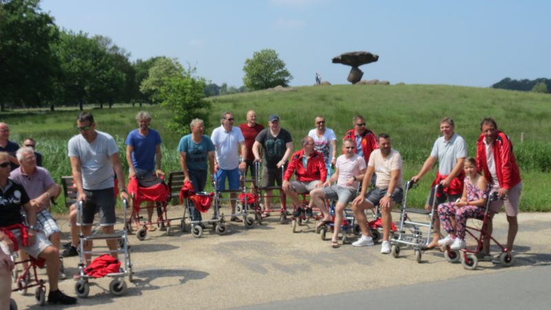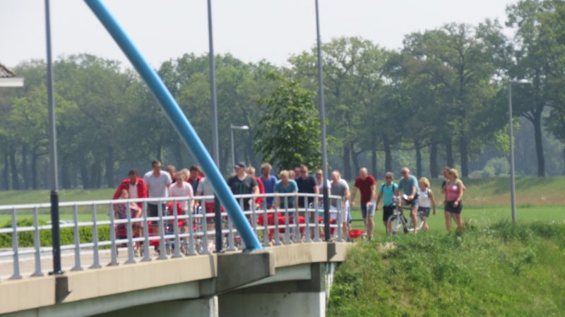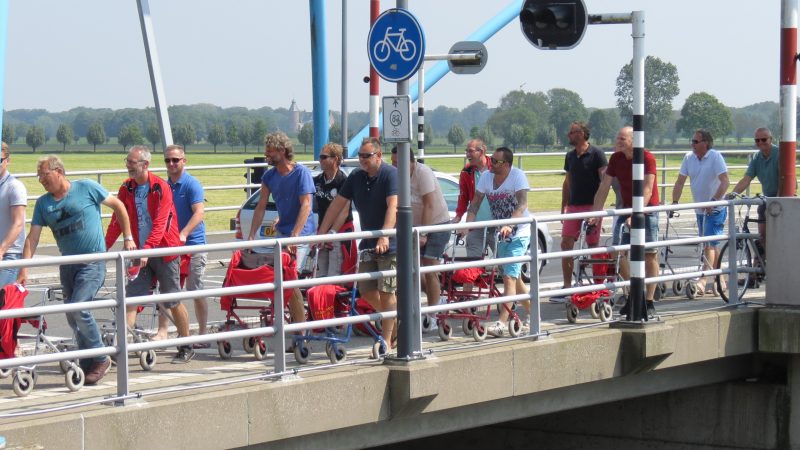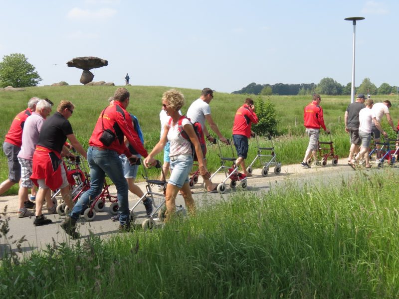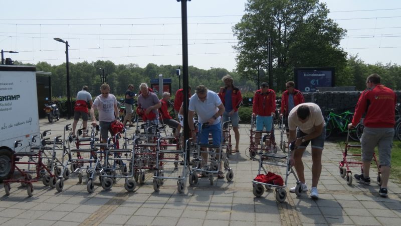 Nadat iedereen zich had omgekleed werd een tour gemaakt langs de sponsors van het team. Eerst werd per auto Bouwcenter Schippers aangedaan en hierna Grand Café Het Oude Station. Na de foto werd er gewisseld van voertuig en omdat de platte wagen bij SV Dalfsen in de ban is gedaan, werd de tocht voortgezet per rollator! Maar liefst 30 rollators waren aangevoerd om de veteranen te begeleiden naar de volgende sponsor De Fabriek. Onder luide aanmoedigingen werd het team Dalfsen binnen geleid en even later smaakten de koele drankjes van Moes voortreffelijk.