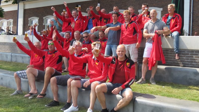 Het organiserend comité had een alleraardigst programma in elkaar gezet om dit kampioenschap te vieren. Eerst was er een kleine huldiging op het zonovergoten Jos Ramaker terras, waarbij Wim van der Vegt de leiders en spelers bedankte voor het geweldige seizoen. Bloemen waren er voor de leiders, een zilveren schaal voor het team en een zak vol consumptiemunten voor de dorstige kelen. Aansluitend knalden de champagnekurken en ging het team op de foto.
