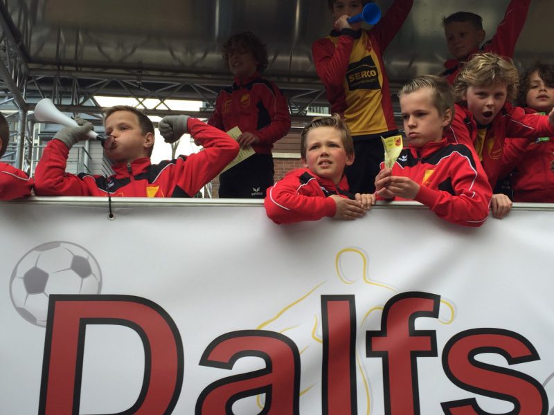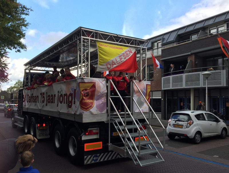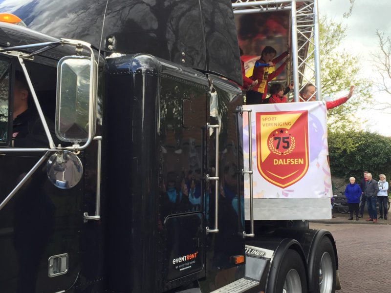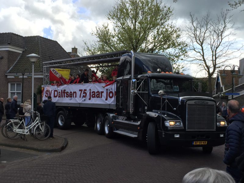 Een wagen van SV Dalfsen, gevuld met ongeveer 25 jeugdleden, reed donderdag mee in de optocht tijdens Koningsdag. Samen met Muziekvereniging Excelsior behoorde de SVD-wagen zeker tot de meest luidruchtige deelnemers!