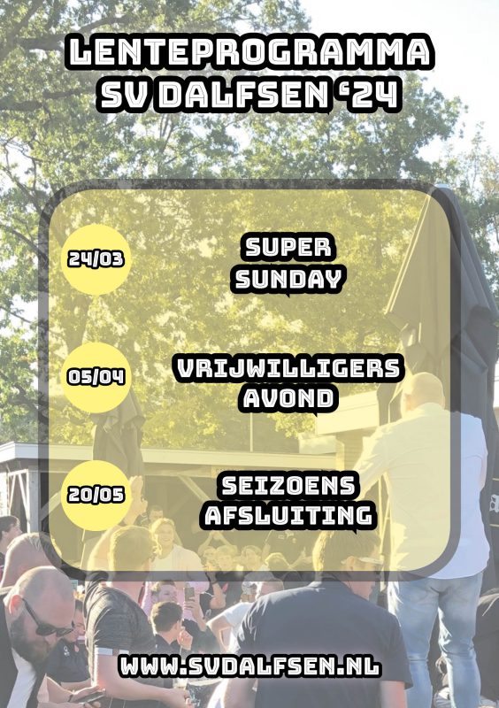 Natuurlijk zijn meer activiteiten bij SV Dalfsen, met dank aan inzet van de activiteitencommissie, de kantinecommissie en alle barvrijwilligers. Noteer in de agenda dat het zondag 24 maart Super Sunday is en dat vrijdag 5 april de vrijwilligersavond op het programma staat. Omcirkel ook Tweede Pinksterdag, maandag 20 mei, want dan is de seizoensafsluiting.