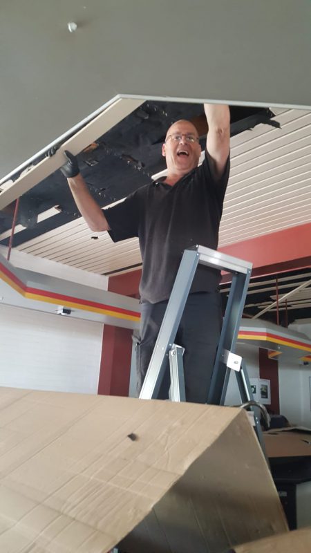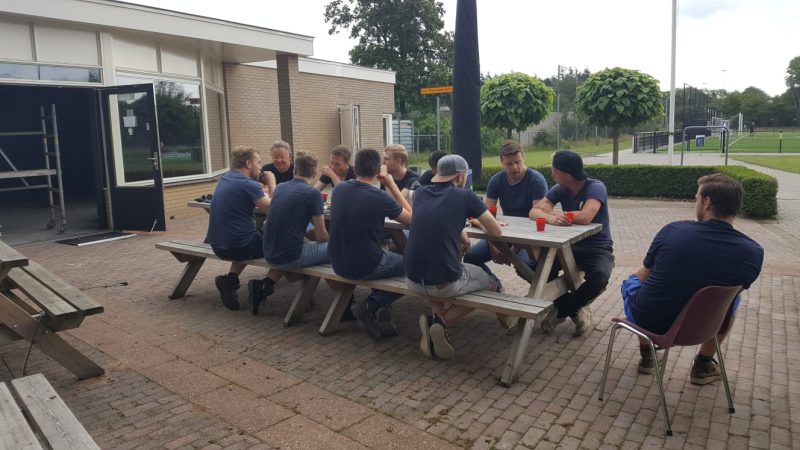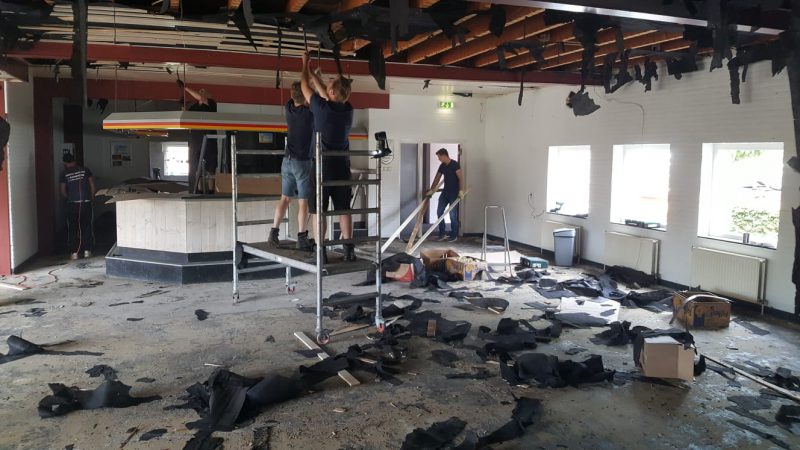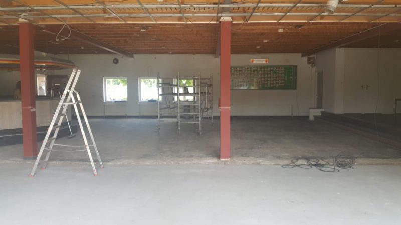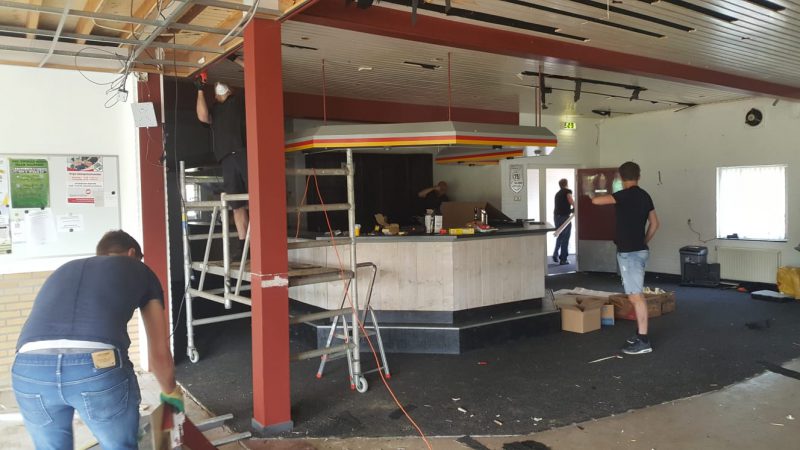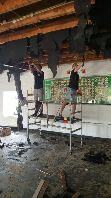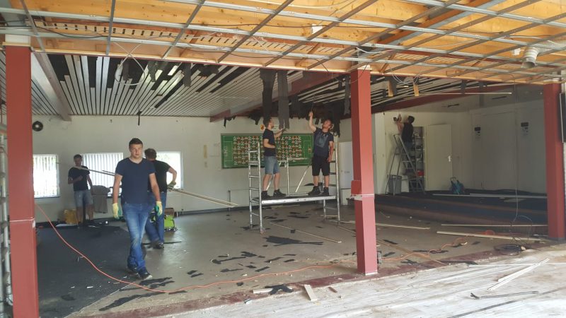 Vrijwilligers van SV Dalfsen zijn zaterdagochtend begonnen met de werkzaamheden aan de kantine. In een paar uur tijd zijn zowel de vloer als het plafond verwijderd, evenals de oude sluiting van het podium.